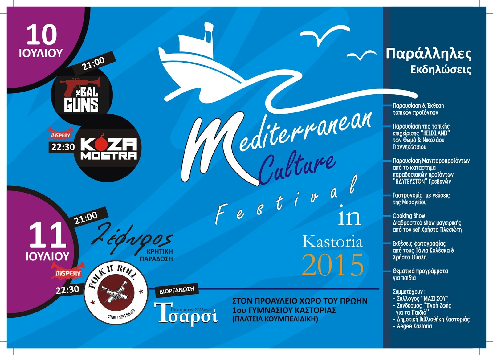 αλλά και της γενικότερης οικονομικής κρίσης που διέρχεται η χώρα μας, το Δ/Σ. του συλλόγου μας αποφάσισε να προχωρήσει στην πραγματοποίηση των προγραμματισμένων εκδηλώσεων, -με γενικό τίτλο, Mediterranean Culture Festival in Kastoria 2015- την προσεχή Παρασκευή 10 και το προσεχές Σάββατο 11 Ιουλίου, μειώνοντας, ωστόσο, το εισιτήριο εισόδου της 1ης ημέρας Παρασκευή 10 Ιουλίου όπου θα εμφανιστεί και το συγκρότημα KOZA MOSTRA από 8 ευρώ σε 5.